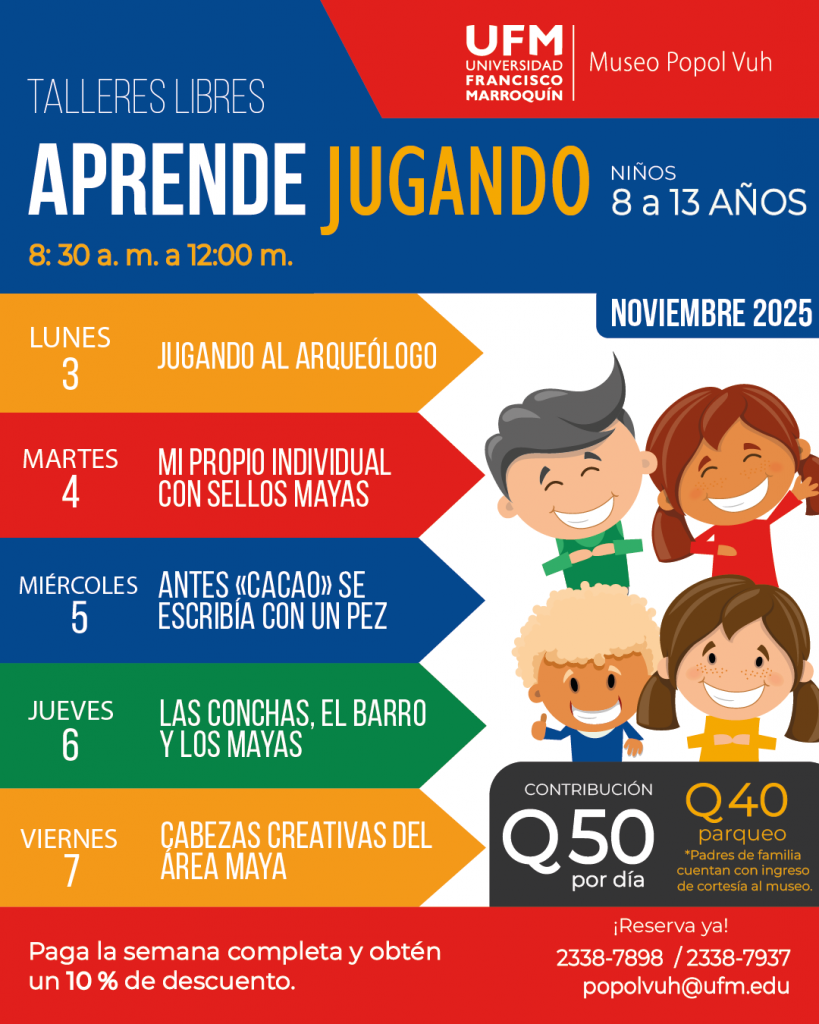 Este taller invita a los niños a sumergirse en la historia y cultura maya a través de la exploración, el juego y la imaginación. Cada día ofrece una experiencia diferente llena de descubrimiento y diversión:
