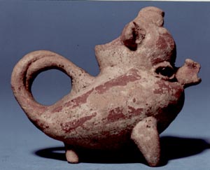Cántaro zoomorfo de cuerpo globular, y borde redondeado. Decoración: pintura roja en la parte superior de la pieza, lo que puede ser el asa una figura zoomorfa con las patas delanteras sobre la cabeza, y las patas traseras salen del cuerpo de la pieza.
