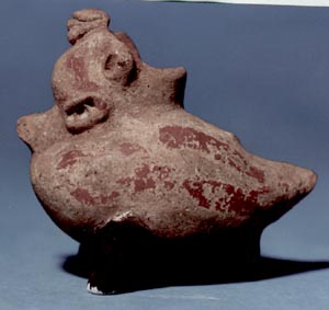 Cántaro miniatura zoomorfo, con pared curvo-alargada, ojos excisos, pico protuberante, tres soportes cónicos, dos bandas de pintura roja simulando las alas, dos protuberancias en la cabeza.