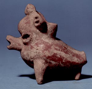 Cántaro miniatura zoomorfo, posiblemente ave, de cuerpo globular, ojos excisos, pico protuberante, con tres soportes cónicos, asa sobre la cabeza decorada con la técnica de pastillaje, y sobre el cuerpo bandas de color rojo.