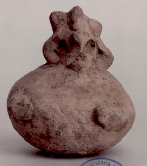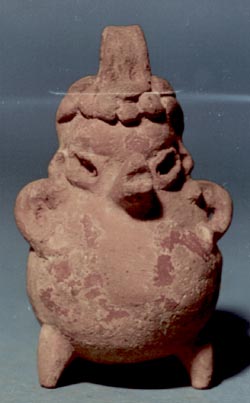 Cántaro antropomorfo de cuerpo globular y cuello recto, base cóncava. Decoración: presenta una efigie humana, con ojos en forma de granos de café, boca entreabierta, de las cejas parecen salir los brazos que rematan con las manos.