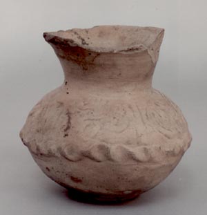 Cántaro de pared globular, cuello curvo divergente, borde evertido, base plana, moldura medial con impresiones de dedo. Decoración: arriba de la moldura páneles con inciso medio que presentan diseños geométricos. Donación: Lodder 23/4/85.