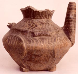 Cántaro subglobular de pared curvada, cuello recto hacia un borde evertido, base plana y una vertedera. La decoración está hecha por líneas incisas dispuestas en un diseño geométrico.