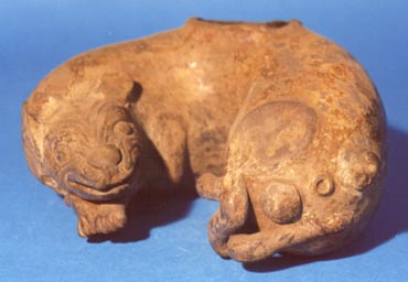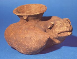 Cántaro con efigie zoomorfa de base ligeramente convexa. Representa a un canino enroscado y acostado que tiene un agujero en la parte superior. Los rasgos del rostro, las patas y genitales están bien delineadas.