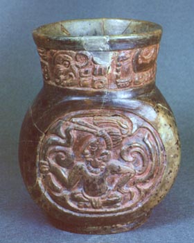 Jarrón de cuello ancho con cuerpo aplanado y base anular. Probablemente la decoración fue hecha a base de moldeado. La pintura roja es de hematita especular y se encuentra en las incisiones para así resaltar el relieve. Uno de los medallones muestra a un noble maya sentado con sus piernas cruzadas y su mano agarra…