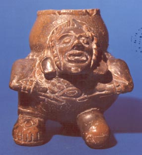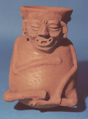 Vasija globular doble con efigie antropomorfa, de base convexa y 2 soportes que los forman las piernas de la efigie. La vasija representa una figura de hombre con los 2 brazos flexionados y con las manos tocando el pecho. Las piernas se encuentran flexionadas, con un pie y una rodilla sobre el suelo.