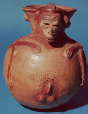 Cántaro con efigie zoomorfa (mono). El cuerpo es globular, cuello divergente con asa y base convexa. La efigie representa un mono araña del cual se observan la cara, extremidades y genitales. Tanto la efigie como el labio del borde presentan pintura roja.