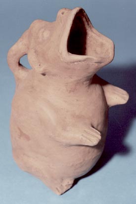Cántaro con efigie zoomorfa de pared curva y base plana. Representa a un animal (pizote?) viendo hacia arriba y con la boca abierta; las manos las tiene a los lados y parece estar hincado. El asa se encuentra en la parte de atrás, en la nuca.