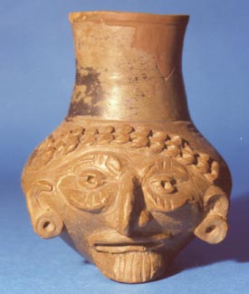 Cántaro antropomorfo de pared curva, cuello vertical y base plana. La efigie representa a un anciano de nariz protuberante y pómulos salientes. El pelo se encuentra realizado por altorelieve. Lleva orejeras redondas y barba. Cerámica plomiza.