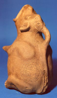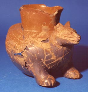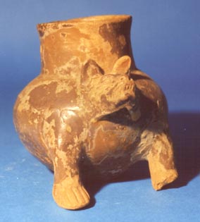 Cántaro zoomorfo. El animal se encuentra viendo hacia arriba y tiene la boca abierta y las manos hacia el frente. La cola parece ser el asa que llega hasta la cabeza. Presenta decoración incisa en una de las piernas: el símbolo de la cruz Kan.