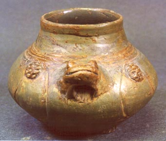Cántaro subglobular de cerámica Plomiza. Tiene pared curva y base ligeramente cóncava. Está decorado por una efigie zoomorfa, talvez un sapo. Además, presenta decoración incisa y aplicaciones.