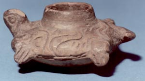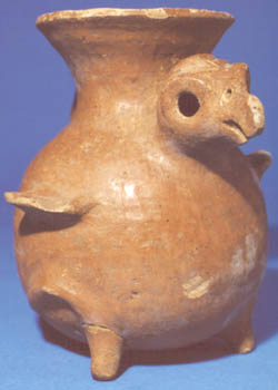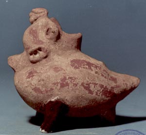 Vasija miniatura formada por una efigie zoomorfa (ave), tiene 3 soportes cónicos. El cuerpo es largo y la cola está enrrollada como formando el asa. La apertura de la vasija se encuentra en la parte superior de la cabeza.