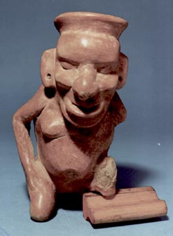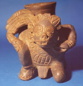 Cántaro efigie con vertedera de la Fase Arenal del sitio de Kaminaljuyú. La efigie representa a un viejo jorobado encuclillo. La cabeza forma el cuello del cántaro y la vertedera se proyecta de su espalda. En la espalda, entre la cabeza y la vertedera pueden observarse los huesos de las vértebras y las nalgas son…