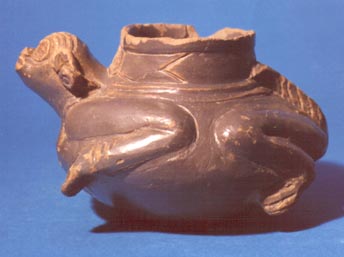 Cántaro subglobular plomizo con base convexa. Representación zoomorfa con las extremidades flexionadas, como si estuviera nadando. Decoración incisa.