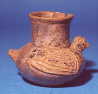 Cántaro subglobular plomizo de base plana. Representación de un ave.