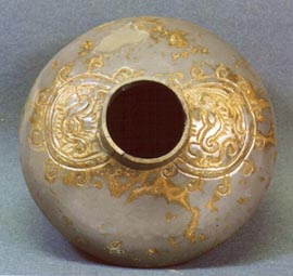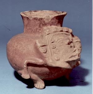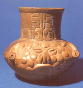 Cántaro subglobular de pared curvada y base cóncava. Céramica plomiza. Decorado por líneas incisas; los diseños tienen forma semicircular y en el interior se observa un rostro de lagarto-serpiente, rodeados por volutas.