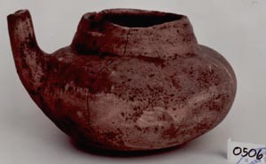 Cántaro de pared globular, cuello curvo divergente, borde redondeado, base convexa. Decoración: rostro antropomorfo, con ojos redondos, boca con expresión triste, mejillas protuberantes con agujeros, orejeras, nariz aguileña, un asa arriba de la nariz. Se pueden apreciar rasgos de decoración negativa (Usulután).
