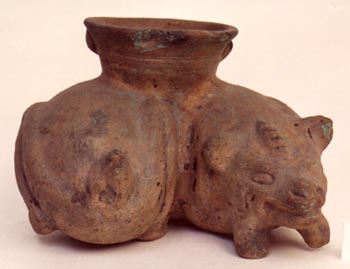 Cántaro en forma de perro, sobre la espalda del perro se encuentra el cuello del cántaro, el cual es divergente, con borde redondeado, dos aplicaciones en forma de pastillaje a los lados, dos líneas en inciso medio y un asa.