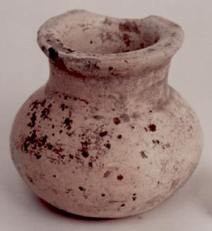 Cántaro miniatura de pared globular, base plana, cuello corto, borde engrosado. Sin decoración. Vajilla Tiquisate.