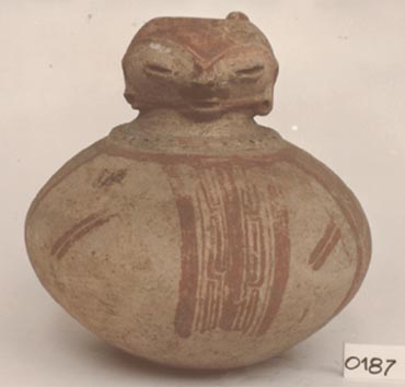 Cántaro de pared globular, base plana, borde redondeado, cuello curvo convergente. Decoración: rostro antropomorfo. En la parte de atrás de la cabeza tiene una vertedera con puente, sobre el cuerpo, y lo que podría ser el cuello lleva un collar en forma punzonada. El cuerpo está decorado con bandas en rojo.