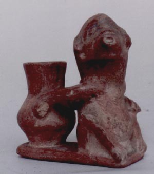 Cántaro con una efigie zoomorfa al frente sentada con las manos hacia atrás sostieniendo el cántaro. Las dos piezas se encuentran sentadas sobre una base alargada que mide 8.7.