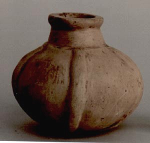 Cántaro de pared globular, base plana, borde redondeado, cuello recto divergente. Decoración: seis acanaladuras verticales en el cuerpo, posiblemente simbolizando algún fruto.