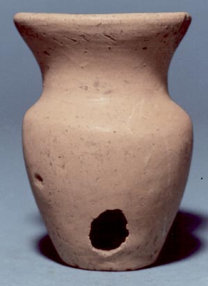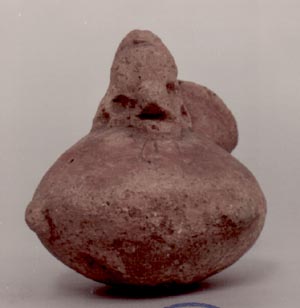 Cántaro zoomorfo miniatura, posiblemente un ave con el cuerpo globular, el cuello se encuentra en en la parte de atrás simulando la cola. Decoración: pintura roja sobre el cuerpo.