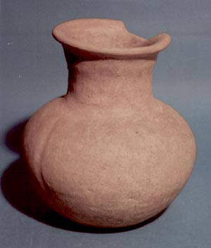 Cántaro de pared curva, base plana, cuello curvo divergente, borde redondeado. No presenta decoración. Vajilla Tquisate.