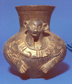 Cántaro de pared globular, cuello largo divergente, base ligeramente cónvexa. Decoración: un jaguar en relieve, con diseños en inciso grueso que terminan en manos. Alrededor del cuello lleva lo que puede ser un collar. La cabeza tiene la función de sonaja, los diseños en la parte posterior de la pieza son con el mismo inciso…