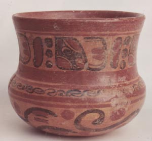 Cuenco de cuello restringuido, base evidencia de trípode, borde redondeado. Decoración: pintura roja abajo del borde y a la mitad de la pieza, diseños incisos de glifos, cerca de la base diseños de aplicaciones en forma de granos de café.