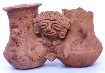 Cántaro doble de pared globular, cuello alto, borde evertido, base plana. Decoración: en el centro de los cántaros el rostro de un personaje antropomorfo decorado con la técnica de pastillaje, presenta collar, orejeras y tocado. Las manos funcionan como asas.
