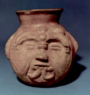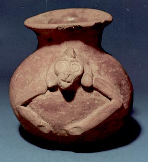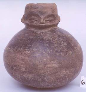 Cántaro de pared globular, base plana. Decoración: antropomorfa, ojos nariz y boca, aza en forma de orejas, con diseños de trenzas a los lados. Donación: Lic. Sergio García Granados. 7/12/83.