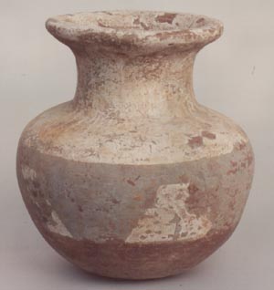 Cántaro de pared globular, cuello alto, borde evertido, base convexa. Decoración: estuco y pintura gris formando diseños de triángulos alrededor de la pared.