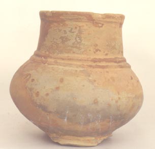 Cántaro de pared globular, base anular, cuello recto, borde redondeado. Decoración: dos molduras alrededor del cuello, acanaladura abajo del borde. Donación: Joya Hairs, 29/12/82.