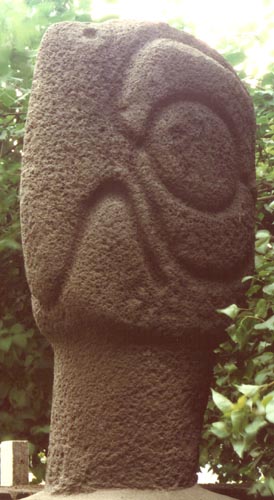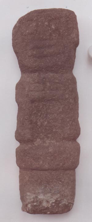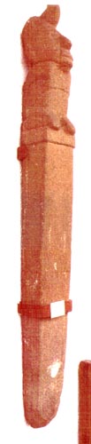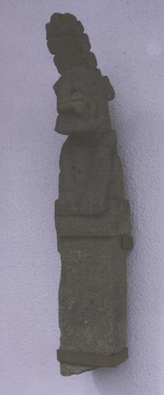 Escultura tallada en forma de espiga, que representa una figura zoomorfa (probablemente un ave), con una extensión del pico, ojos redondeados rodeados de un diseño en forma de C acostada que los encierra, y el pico forma un diseño en forma de A bajo los ojos. Se encuentra expuesta fuera del edificio.