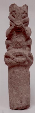 Escultura de piedra con espiga vertical, que representa la cabeza de un animal, posiblemente un venado.