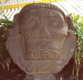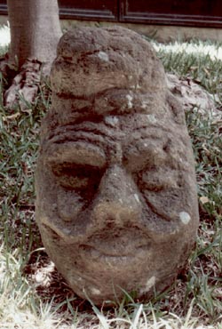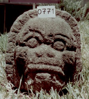 Escultura tallada en forma de espiga, que representa un rostro antropomorfo. Presenta ojos redondeados hendidos, nariz en forma triangular, dientes expuestos, tocado con diseño de líneas verticales. Tiene una mandíbula abierta y una hendidura redondeada sobre la extensión de la mandíbula, a la altura de los ojos. La pieza se encuentra expuesta afuera del edificio.