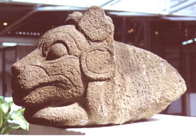 Espiga zoomorfa, jaguar sentado sobre un banco, con la boca abierta, y tocado en forma de cabeza de lagarto.