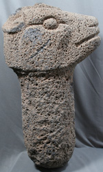Escultura tallada en roca volcánica, en forma de espiga, que representa una cabeza zoomorfa, con ojos redondeados, cejas hendidas, boca abierta mostrando los dientes. Tiene un diseño en forma de cuadrados en el contorno de la cabeza, y a los lados un diseño en forma de C invertida.