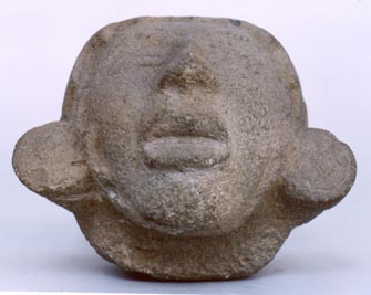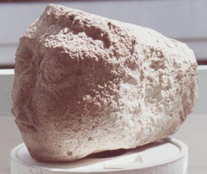 Escultura tallada en piedra caliza, en forma de rostro humano, con ojos alargados. Presenta un desnivel a la altura de la frente.