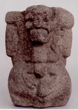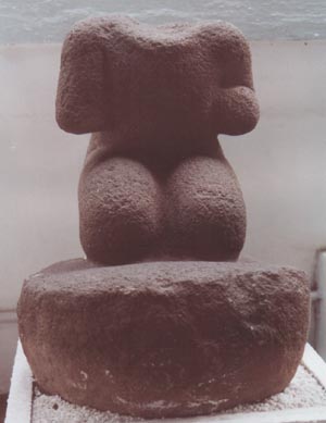 Escultura que representa el dorso de una mujer embarazada, con ambas manos sobre el estómago y hacia el frente. En la espalda lleva un diseño antropomórfico, monstruoso.