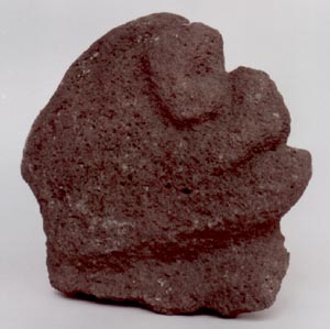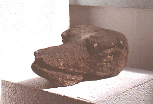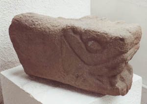 Escultura tallada parcialmente, que representa una cabeza zoomorfa, probablemente una serpiente. Al parecer es un fragmento de construcción, para colocarlo dentro de una pared.