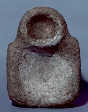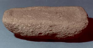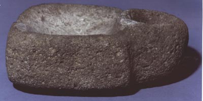Metate sin soportes tallado en piedra, con un espacio circular y uno cuadrado.