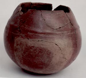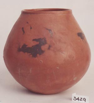 Cuenco globular con base plana, paredes curvo convergentes, boca restringida, erosionado sin decoración y con faltantes en el borde.