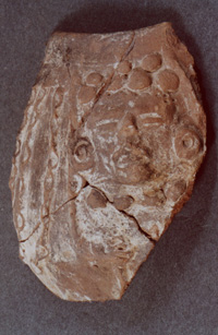 Fragmento de un posible cantaro, con pared convergente y borde redondeado, decoracion modelada de un personaje con los ojos cerrados, boca abierta , orejeras, collar y decoraciones de pellizcado y pastillaje.