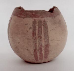 Tecomate de pared curvo convergente, base cóncava, borde redondeado. Decoración: una banda roja abajo del borde, sobre la pared cuatro diseños en rojo de tres líneas rojas verticales, separadas equidistantemente.