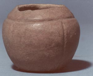 Tecomate de pared globular, borde convergente y base plana. Decoración: acanaladura abajo del borde, cuatro acanaladuras verticales sobre el cuerpo.