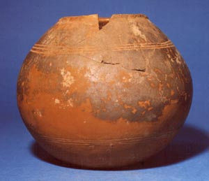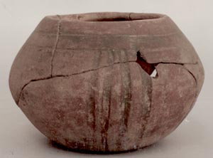 Tecomate de pared globular, base plna, borde redondeado. Decoración: tres líneas incisas medias abajo del borde y tres cerca de la base. Cerámica plomiza.