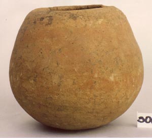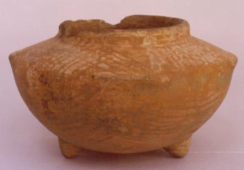 Tecomate de pared globular, cuello vertical, borde redondeado, base trípode, soportes cónicos. En la parte media de la pieza tiene 4 protuberancias. Decoración: una serie de líneas curvas cruzadas. La decoración presenta lo que puede ser un falso Usulután. Donación: Lodder 23/4/85.