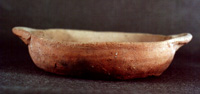 Plato de superficie burda, paredes curvo divergentes, borde de labio redondeado y base plana. Dos agarraderas en el borde, con impresión dactilar al centro pero sin perforarlas.